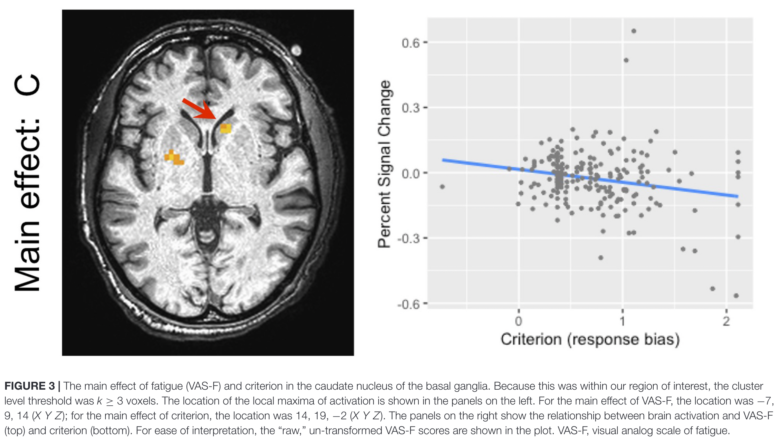 Our results show that both criterion and d’ were correlated with changes in cognitive fatigue: as fatigue increased, subjects became more conservative in their response bias and their perceptual certainty declined. Furthermore, activation in the striatum of the basal ganglia was also related to cognitive fatigue, criterion, and d’.