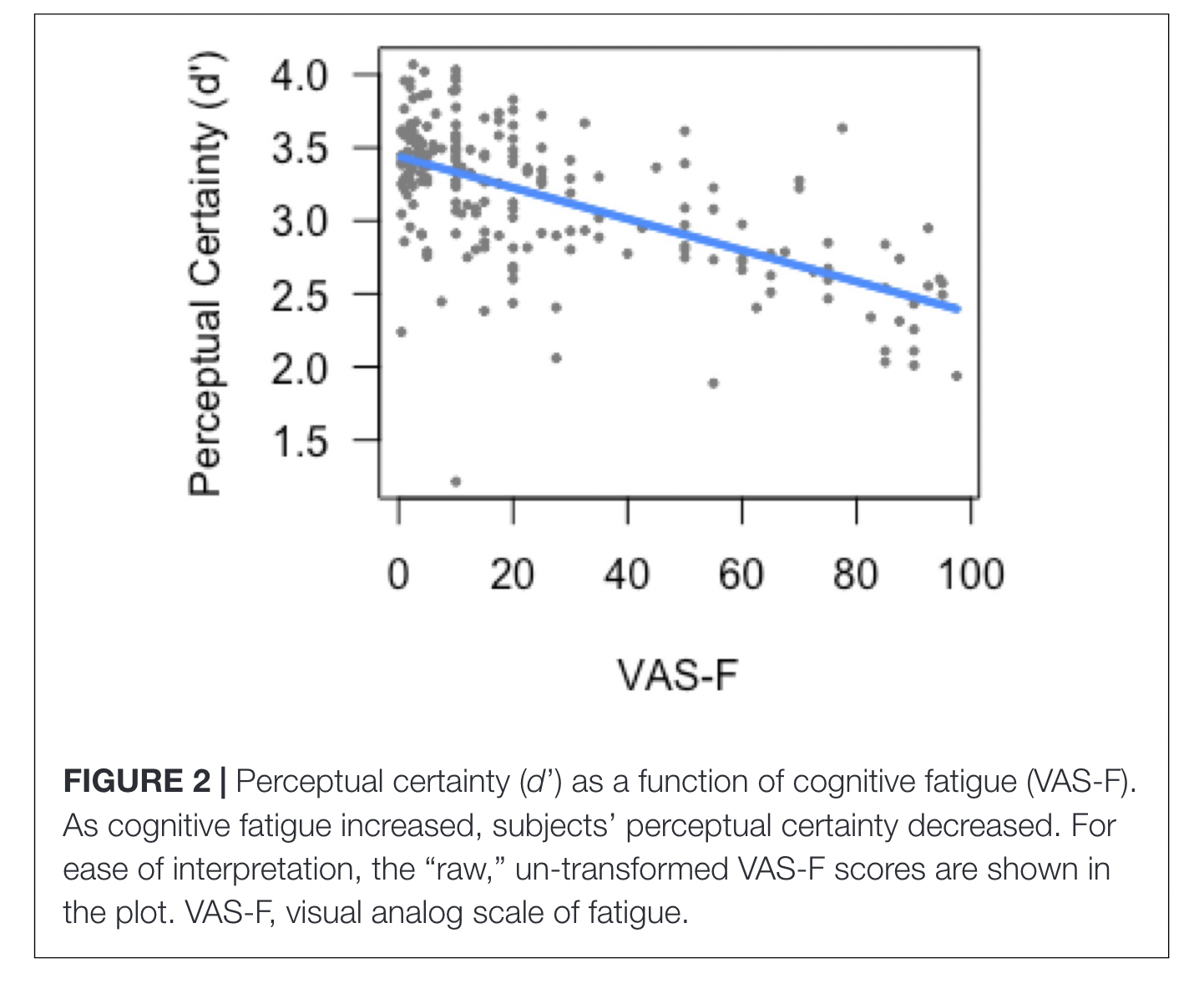 The metrics of signal detection theory (SDT)—response bias (criterion) and perceptual certainty (d’) may change as a function of fatigue, but no work has yet been done to examine whether these metrics covary with fatigue.